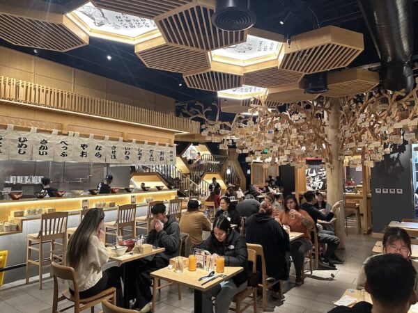 Kyuramen’s distinctive aesthetic is in full force at the Arcadia location—a blend of traditional Japanese elements with modern industrial touches tossed in. The look is spread over 3,636 square feet.