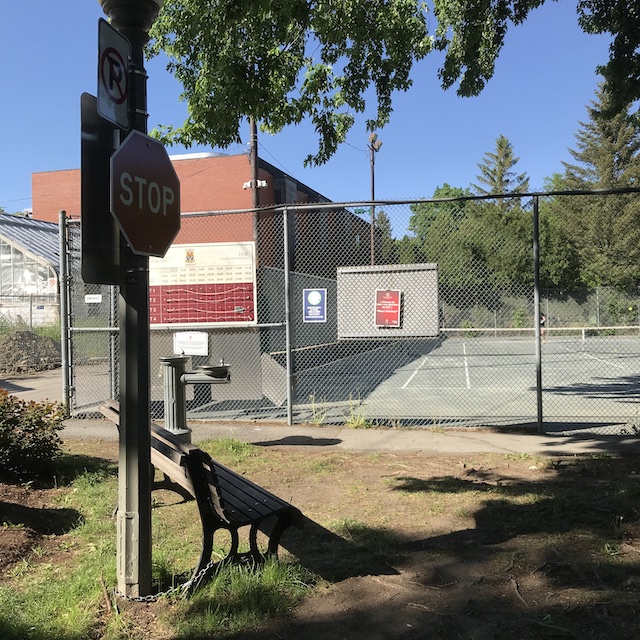 This oddly angled bench, next to a drinking fountain and a shading tree, draws all its meaning from the presence of the tennis courts that are part of the neighbouring Westmount park. Its use can be appreciated by the stretch of exposed bare ground near it; note however the absence of litter around it … probably mindful users and/or good maintenance!