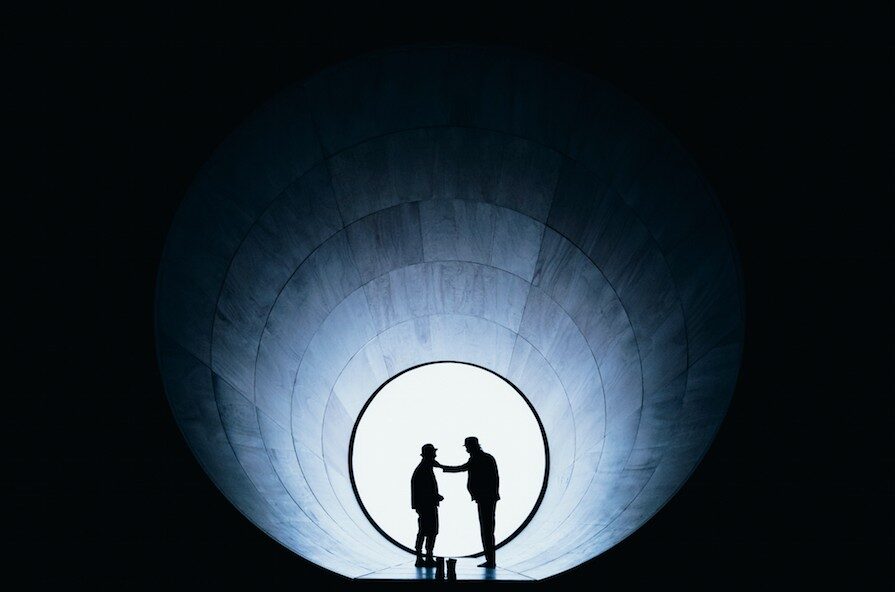 Reeves and Winter come across as film actors not used to the stage, underplaying their intentions and failing to convince that their characters’ bond is essential to their survival. Estragon and Vladimir are symbols of mankind, caught in a desolate no-man’s land (represented by set designer Sutra Gilmour’s enormous wooden tunnel receding into nowhere), and seeking rescue from a savior (Godot) who never appears. They pass the time with desperate jokes, exchanging of philosophy, and whatever distractions come along (Pozzo and his manservant Lucky—more on them later). They are all each other has and that connection is vital to the play. But the two stars deliver little subtext and do not convince us they need each other. They do summon up a desperately pathetic comic energy in the second act as they slide down the sides of Gilmour’s tunnel and Reeves bursts with anguished frustration after Winter informs him for the umpteenth time they can’t leave because they are waiting for Godot. Winter also skillfully portrays Vladimir’s devastating realization that the title character is not coming.