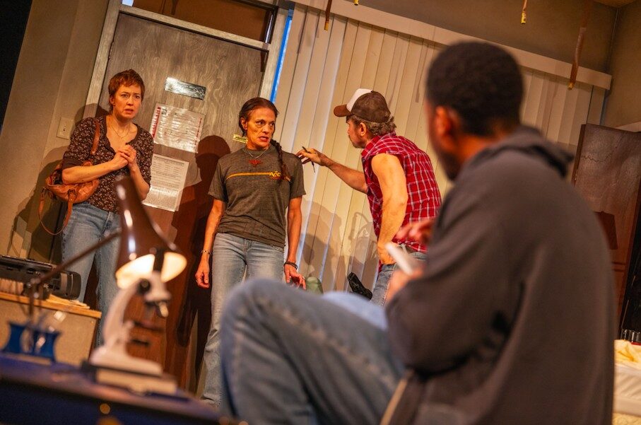 Director Cromer builds the suspense skillfully, beginning with Agnes standing silently in the dark, getting high. The phone rings. She picks it up, no one answers. She curses at the other party and hangs up. The action proceeds slowly from this point as Peter enters the scene, introduced by Agnes’ lesbian pal R.C. (flinty Jennifer Engstrom). At first it seems Peter is a possible sweet savior, comforting the distraught Agnes and stepping in between her and her bullying ex, Jerry (appropriately asshole-ish Steve Key). But it’s soon revealed Agnes has leapt from the frying pan into the fire as Peter’s bizarre obsessions with insects and the military-industrial complex surface. Letts weaves a web of intrigue and fear so subtly that we don’t even know we’re caught in it until it’s too late. Cromer’s clever staging accelerates until a devastating conclusion.