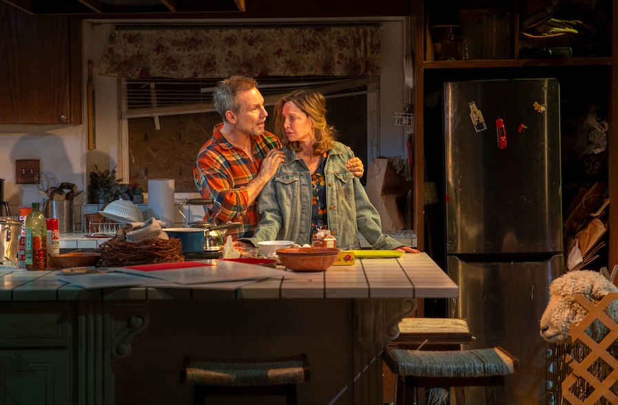 The basic plot echoes the works of Chekhov, Williams and O’Neill with the dysfunctional Tate clan clawing each other over the fate of their home and ranch in California (Arnulfo Maldonado designed the hyper-realistic kitchen set.) Alcoholic dad Weston (a grizzled Christian Slater) plans to sell off the land in order to pay his enormous debts, mostly for bar tabs and restoring antique cars. Mother Ella (appropriately desperate and harried Calista Flockhart) has similar designs, but wants to use the profits to flee to a fantasy life in Europe. Their two children, Wesley (a zombie-like Cooper Hoffman) and Emma (razor-sharp Stella Marcus) seek to establish their own identities in different ways. Wesley wants to stay on the land and make it work while Emma, like her mom, indulges in elaborate dreams of escape involving fishing boats and becoming a mechanic.