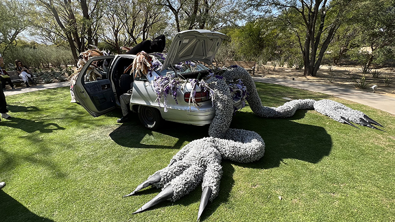 Paloma Contreras Lomas (Amar a Dios en Tierra de Indios, Es Oficio Maternal) addresses topics such as patriarchy, violence, class segregation, colonial guilt and middle-class identity with a humor. An absurd array of tangled limbs of two mysterious characters wearing long hats sprawl out of the car and onto the site’s pristine, manicured grounds.