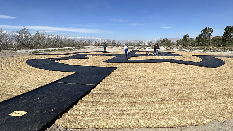 Gerald Clark transforms a traditional Cahuilla basket {Immersion) into a giant game board, using didactical cards of his creation. According to the game rules, somebody can only reach the center by answering correctly questions relating to the traditions and histories of the Cahuilla Indians.