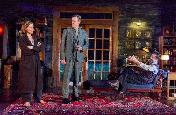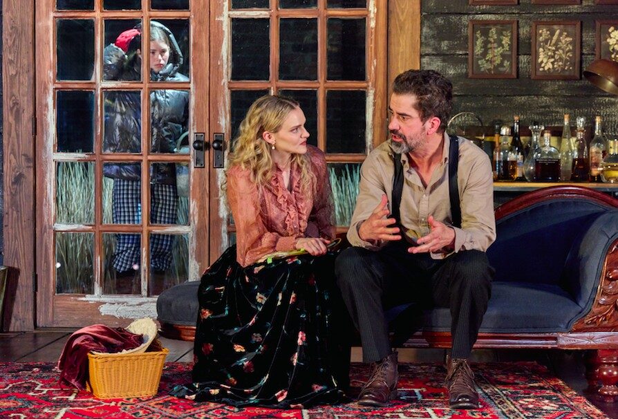 Schmidt also inserts a sub-theme of the adults’ indifference to Dolly’s environmental causes. Michael mentions his house has been destroyed in recent wildfires and Dolly insists on planting trees to balance out her parents’ gigantic carbon footprint caused by their international travel. This is a potentially impactful aspect of the story, but Schmidt does not develop it fully. Set designer Brett J. Banakis does incorporate outdoor plant life into the couple’s handsome rustic residence.