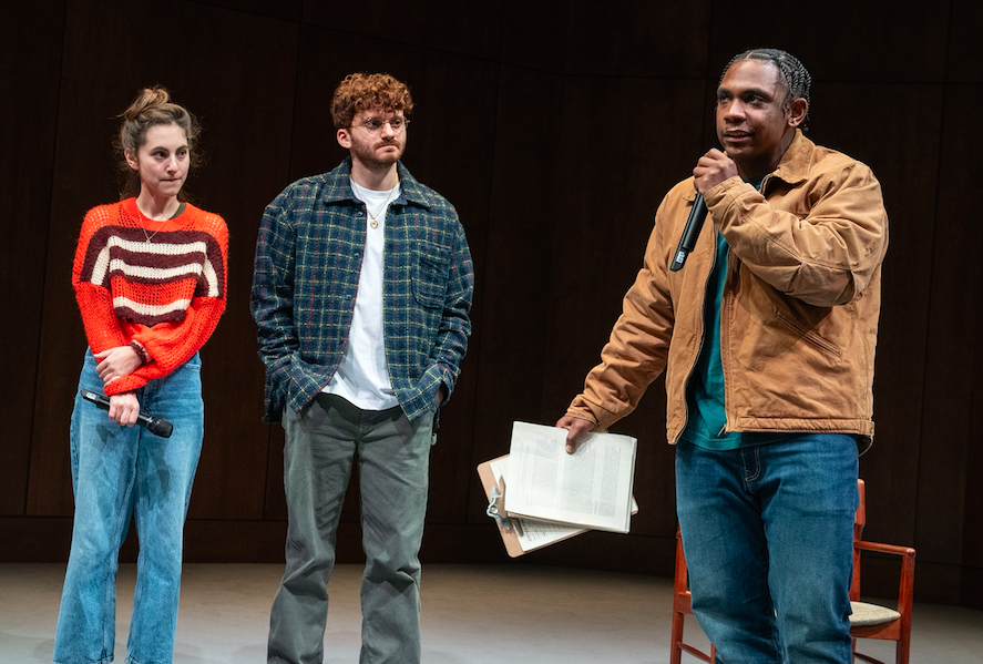 It so happens the author of the document, Nakia (a blazing Cherise Boothe) is Asaf’s former girlfriend and his wife, the Korean-American Gwen (Joy Osmanski making the most of a relatively brief role), works for the university in pushing through a controversial housing project. In addition, Asaf is soon drawn into a hot-button campus conflict over freedom of speech. All these plot tracks clash in a powerful five-sided symphony of political discord—this is the heart of the play. Asaf, Nakia and Baron are joined by two students representing radical-left young American Jews (quirky Madeline Weinstein) and displaced, frustrated Palestinians (shattering Michael Khalid Karadsheh) as opinions, data, and passions fly. It’s stimulating, exciting theater.