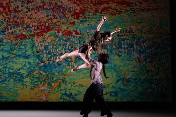 The third ballet, On the Other Side, with Mark Bradford’s multi-colored splashed backdrop and more Philip Glass music, doesn’t directly reference Balanchine’s Emeralds ballet from Jewels, yet it was the one that found favor with The Scoop‘s Sarah Skubala.