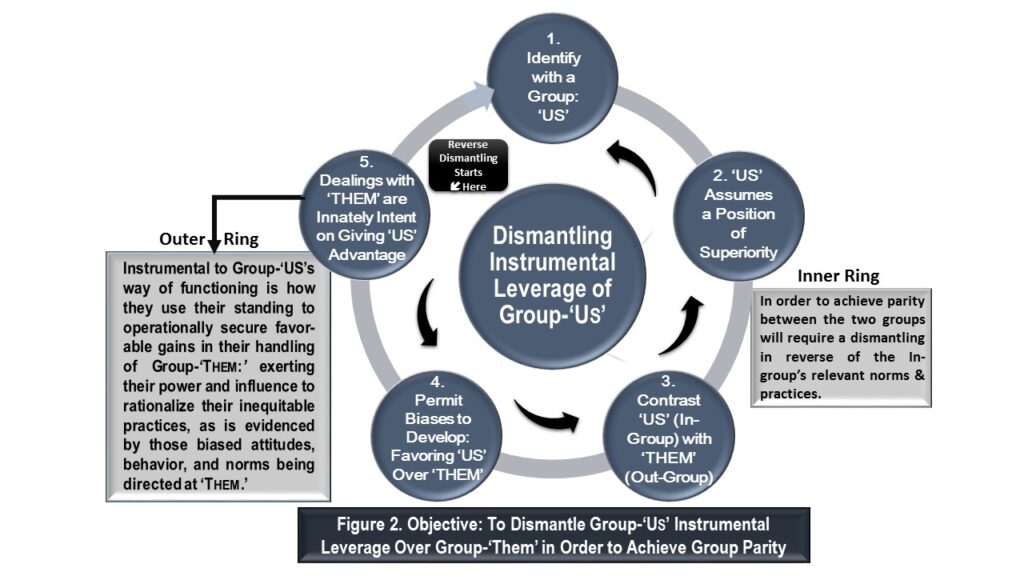 Irrespective of whether it’s an informal groups setting, or formal groups setting within an organization, the same correctional approach is taken: referring back to Figure 2’s inner ring, it becomes a matter of dismantling what’s been erected and replacing it with something more equitable. Group-‘Us’ will need to conduct a ‘leverage-dismantling workshop,’ following the steps listed next.