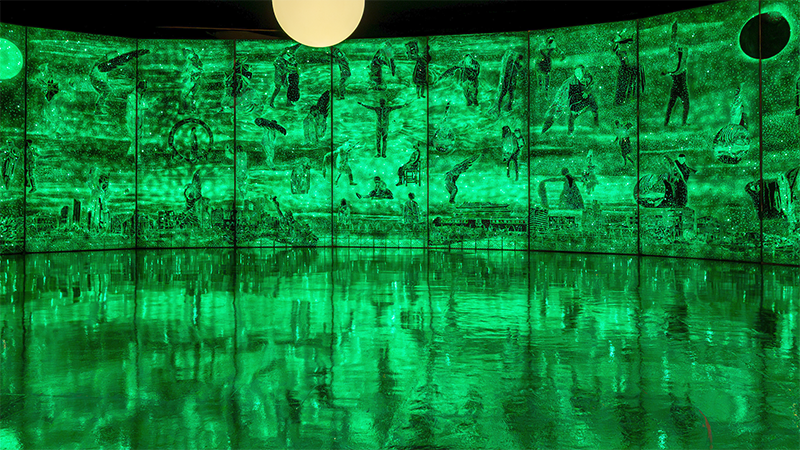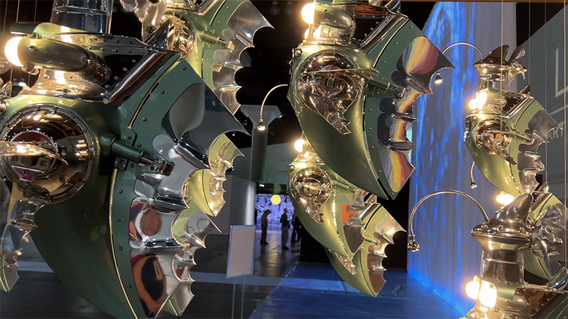 Three works by four Argentinean artists were remarkable: a 120-foot long textile that commemorates LGBTQ communities by the duo Leo Chiachio and Daniel Giannone; Cristian Castro’s 27 dee-sea robotic fishes made out of discarded components to remind us of ocean pollution; and Luciana Abait, large-scale “Agua / Water”, a projected waterfall to foster a poetic awareness of water as a sacred resource for humanity, some details of which show as a background to the credits in my film.