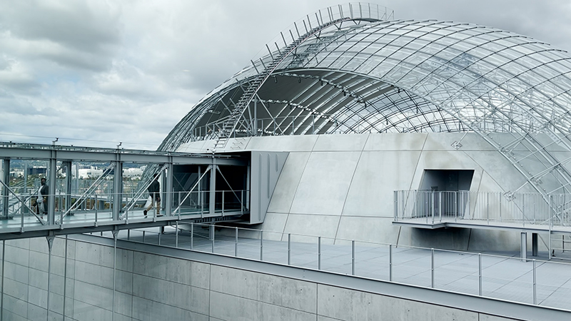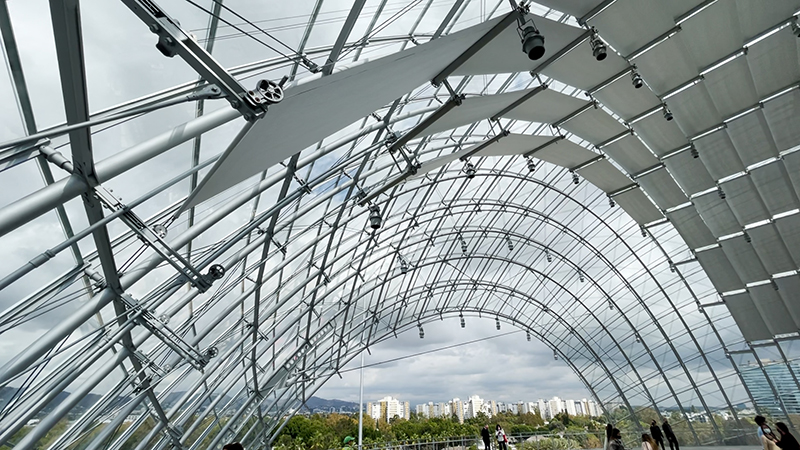 Piano stripped the former May Co. department store to its bones. Then he created an atrium that contains the escalators and the elevators. A glass curtain wall entirely replaced the north façade of the Saban Building. The two parts of the building are connected by filigree steel-glass bridges. The bridges consist of glass roofs and parapet glazing. The museum’s massive, 690-panel theater is supported by four columns with seismic isolators and can move freely up to in an earthquake. The Geffen Sphere is covered by a steel-glass dome that has been manufactured and installed by the German firm Gartner.