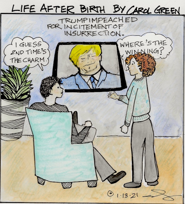 Who woulda thunk we’d be here today? Not fun, though I am thrilled that Trump has been impeached again. Still in the White House, he’s let a plague kill hundreds of thousands of people while he plays golf. And what do the Republicans do? They send in the militia to raid the Capitol with weapons of mass and other destruction – like a gallows. Tell that to your uncle who thinks you’re a commie for being a democrat.