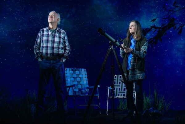 Donald Margulies’ tender and moving new play Lunar Eclipse from Second Stage at the Signature Theater Center, is a simple, direct depiction of a long marriage, the elusiveness of memory, and the endurance of love. George and Em, an elderly couple, are sitting up in a field in the middle of the night on their farm in Western Kentucky, to obverse the titular astronomical event. As the seven stages of the eclipse progress, we gradually learn the intricacies, compromises, joys and pitfalls of their decades-long union. George is going through a deep depression after the loss of his beloved dog (the last in a long line of cherished canines) and his growing frustration with the futility of life in general. “We’re taught that good triumphs over evil. Right? And love and generosity triumph over hate and greed. But, what if it turns out we’re wrong. The bad guys won the battle?” he moans, without specifically naming any political figures or movements. Even Em’s cheerfulness drives him to distraction.
