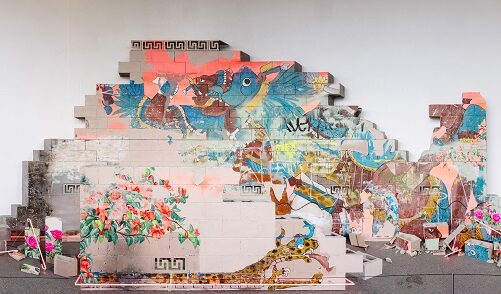A huge mural gone wild, Battle of the City on Fire of 2025, by Patrick Martinez, decorates three crumbling sections of a cinder block wall. At the top of the 30-foot central wall, a large blue bird painted in a vaguely Aztec style attacks a smaller brown one. In the center, a bougainvillea with orange flowers spreads across the wall. At the bottom, a golden dragon with brown spot and bared teeth seems to be moving toward his unseen prey to the right. There are fragments of spray-paint graffiti, broken and smoke-covered cinder blocks, a general feeling of chaos. It’s a lot to take in.