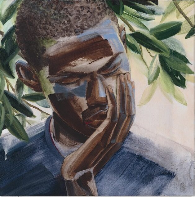 Greg Breda’s Here I Am of 2025 presents a much more serious image, a head-and-shoulders portrait of a young African-American man in a blue sweater. Eyes closed, he raises his left hand to cradle his head as if in deep thought. In the background are the dusty green leaves of an olive tree. Like a German Expressionist painting from a century ago, Breda’s loose, confident brushwork applies colors in unusual ways — using the green of the leaves, for example, as shadows on his face. It’s an impressive work.