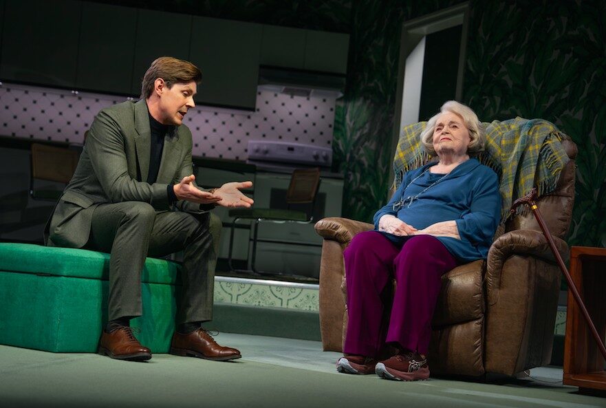 Now a decade after the original NY production, a Broadway version presented by Second Stage at the Hayes Theater has an even deeper resonance. Artificial intelligence (AI) has arrived, and the play is more immediate as the possibilities Harrison raises of duplicate departed loved ones come closer to reality. Memories become distorted when more palatable, idealized versions of the past are fed into the artificial beings’ software. For example, Marjorie and Walter’s proposal story is embellished from taking place after the couple went to the movies to see the silly comedy My Best Friend’s Wedding to the more romantic image of taking in the classic Casablanca at a charming indie theater. These distortions gradually become the accepted version as AI bots multiply and take over the flesh-and-blood characters’ shared narratives. Another theme becomes heartbreakingly clear as each member of the family must accept a death and turn to the AI-generated doppelgangers for consolation rather than facing the loved ones’ permanent absence. Harrison is examining our modern tendency to suppress our true emotions with fuzzy feel-good substitutes.