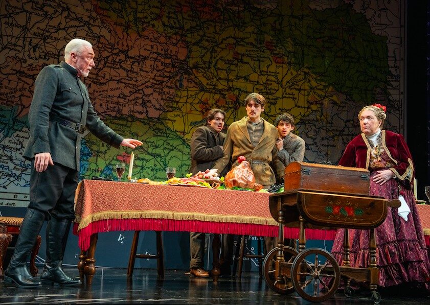 Joseph sharply satirizes patriotic fervor and nationalistic honor with the scheme’s ruthless recruiter, Dragutin “Apis” Dimitrijevic, referred to as “The Captain,” played with gravelly gusto by Patrick Page. He plies the starving boys with a lavish meal, presented by his eccentric cook (Kristine Nielsen, riotously funny as always), and regales them with bloodthirsty tales of heroism to get them to sign up for certain death. Dark humor vies with existential dread as the young men struggle to understand their destiny and finally yearn for the simple pleasures of life—finding love, raising a family, enjoying a sandwich. Director Darko Tresnjak perfectly balances the conflicting strains of comedy and tragedy.