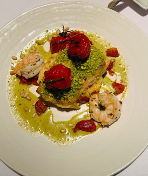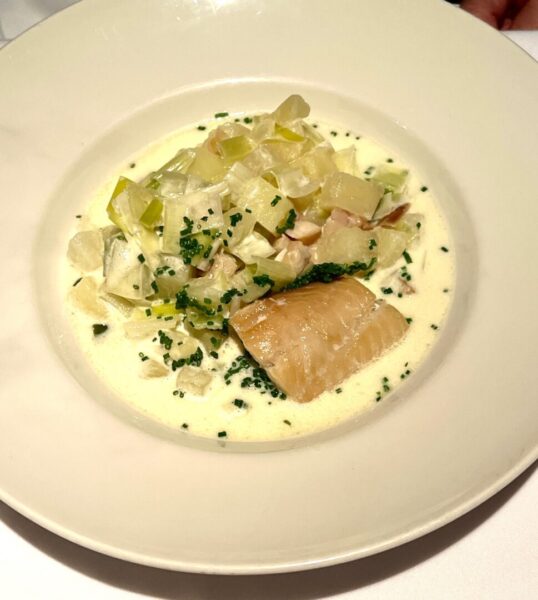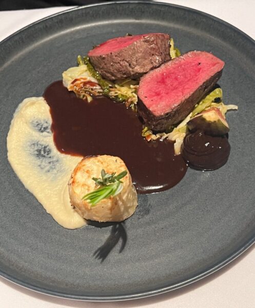 I was particularly anxious to try the venison, which arrived rare and surrounded by a balsamic and fig jam and a raspberry reduction. The venison was tender and delicious – with only a slight hint of the gamey flavor that is the grace of venison. The chef passed the test!! My companion’s halibut and prawns was tasty and perfectly cooked, but perhaps a bit straightforward.