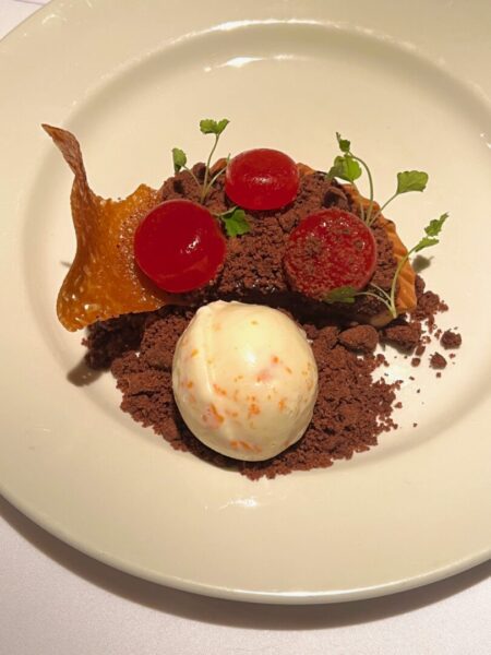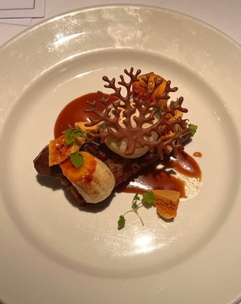 The menu included a tempting selection of desserts, from which we chose a blood orange chocolate tart and a banana loaf – both delicious choices with beautiful presentation.