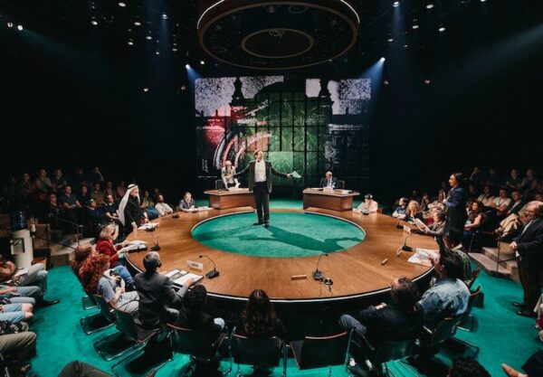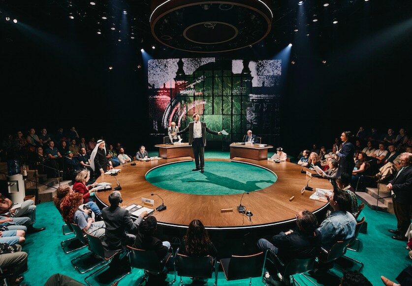 Part espionage thriller, part political dogfight, part science lecture, but by no means boring, Kyoto is an exciting, enrapturing theatrical spectacle. Stephen Daldry and Justin Martin’s direction moves the play along like a locomotive (I couldn’t think of a carbon-neutral simile—a racehorse, perhaps). Audience members are directly involved with some seated with the actors as conference members at set designer Miriam Buether’s huge circular meeting table which also serves as a stage. We are also given ID badges with different countries and info on their carbon footprint. Neon signs and Akhila Krishna’s impressive video designs flash vital climate stats, acronyms for national alliances, power points, and visual information.