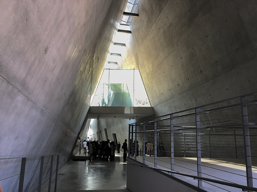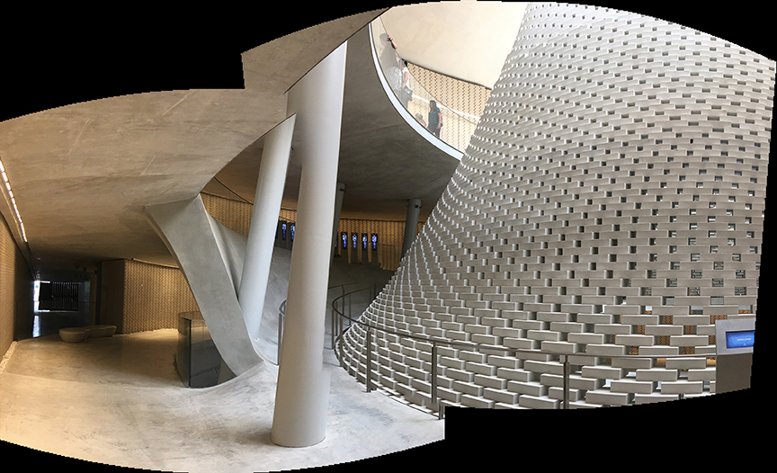 This memorial, designed by Kimmel Eshkolot Architects, was completed during 2018. It is dedicated to commemorating the country’s fallen soldiers. A 250 meter-long continuous ‘wall of names’ wraps around the central sculptural brick structure. This comprises more than 23,000 concrete bricks each individually engraved with the name of a soldier and their date of death. The architects developed the scheme as an interior project where the ground was excavated to allow daylight to enter through an overhead oculus.
