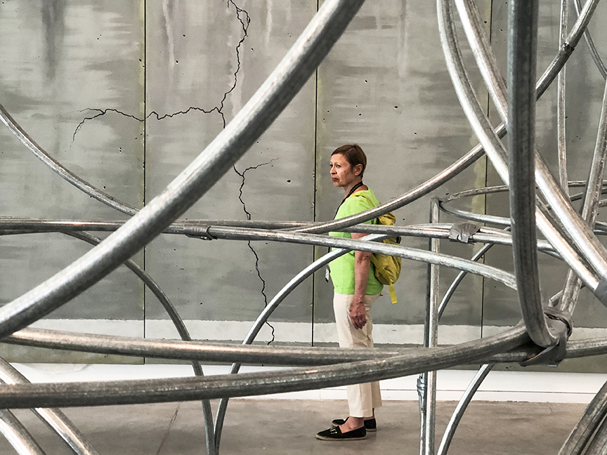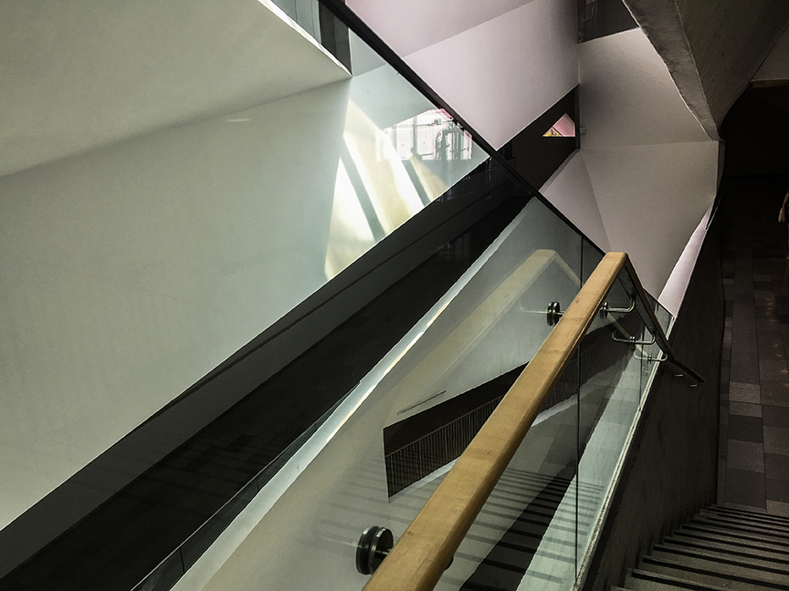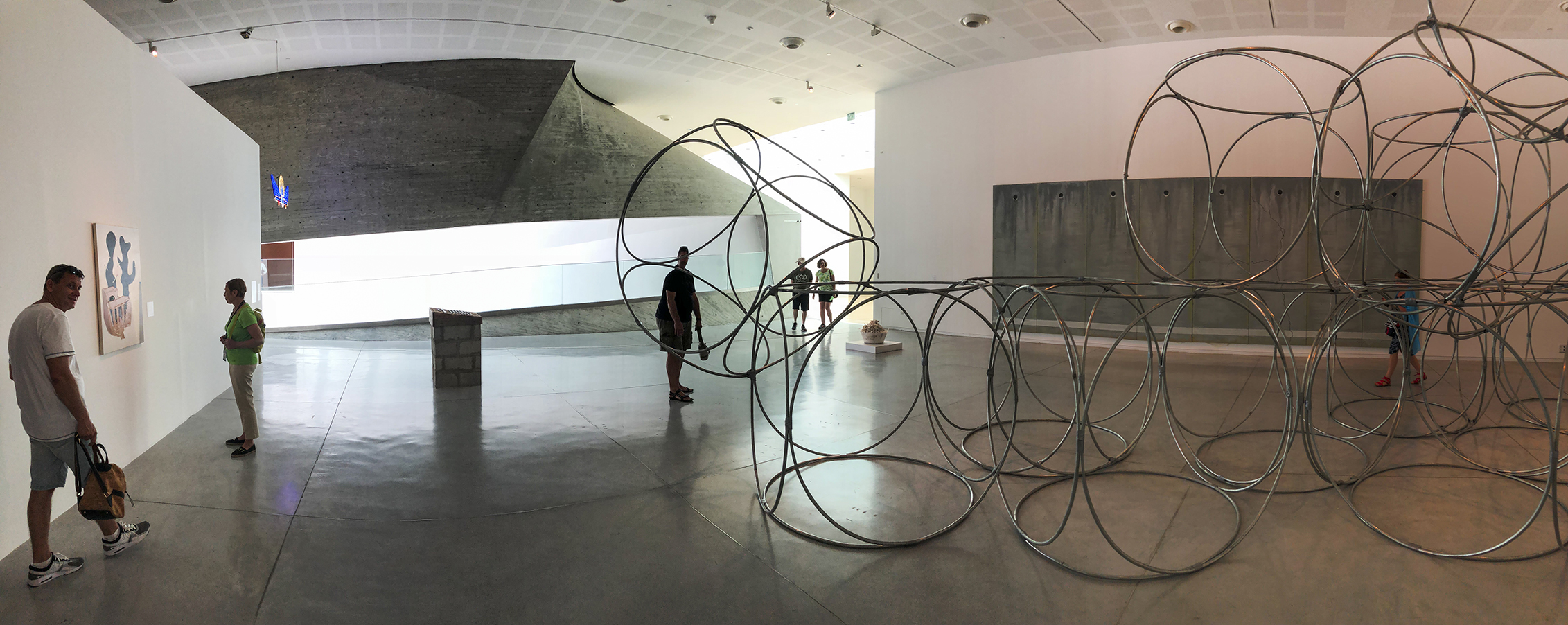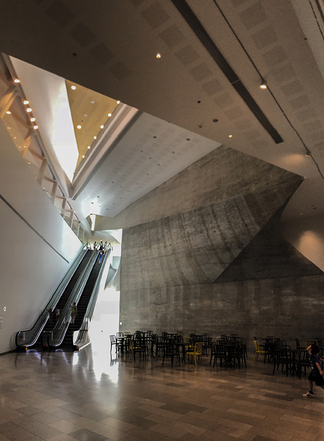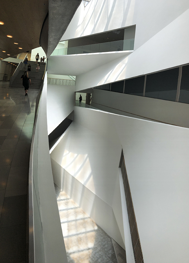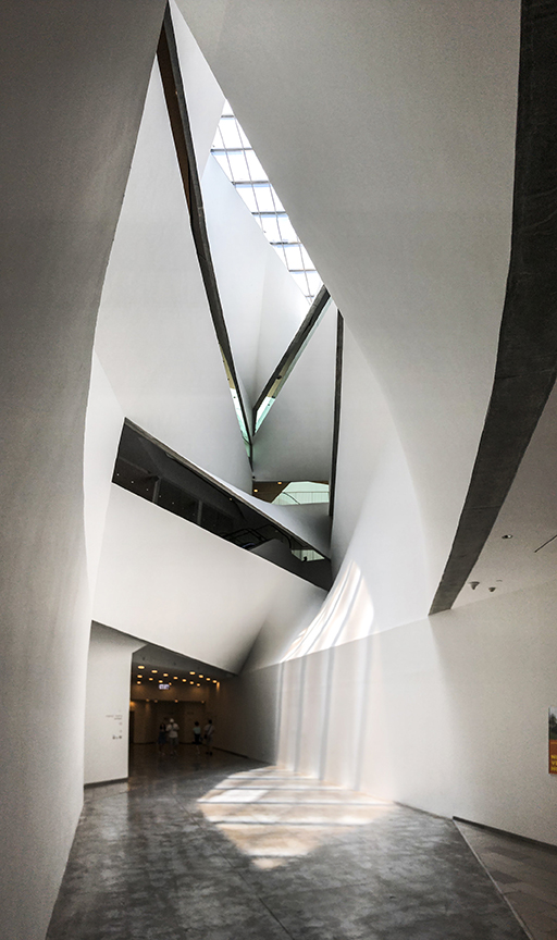 Subtly twisting geometric surfaces (hyperbolic parabolas) connect the disparate angles between the galleries and the context while refracting natural light into the deepest recesses of the half buried building. Designed by architect Preston Scott Cohen.