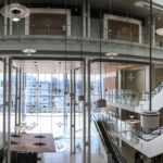 50 desks within the reception areas minimize visitor waiting time, while three atria ensure that space is filled with natural light. A system of vertical and horizontal circulation routes lead to the 90 courtrooms above. The subsequent three volumes, which contain around ten-story each, include offices and meeting rooms: the second is the domain of the magistrates, the third of the public prosecutor’s offices, and the fourth and final volume houses the presiding judges.