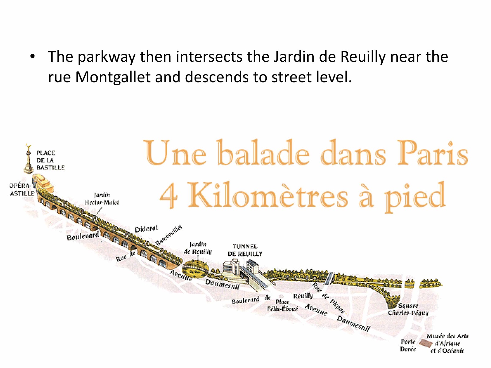 The Promenade plantée (also called Coulée Verte – “Green Stream”) is an extensive green belt that follows the old Vincennes railway line. Beginning just east of the Opéra Bastille with the elevated Viaduc des Arts, it follows a 4.7 km (2.9 mi) (2.9 mi) path to the Bois de Vincennes.