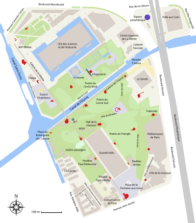 The Parc de la Villette is a 37-acre / 55 hectares area that houses one of the largest concentration of cultural venues in Paris. These include the Cité des Sciences et de l’Industrie (City of Science and Industry, Europe’s largest science museum), three major concert venues, and the prestigious Conservatoire de Paris.