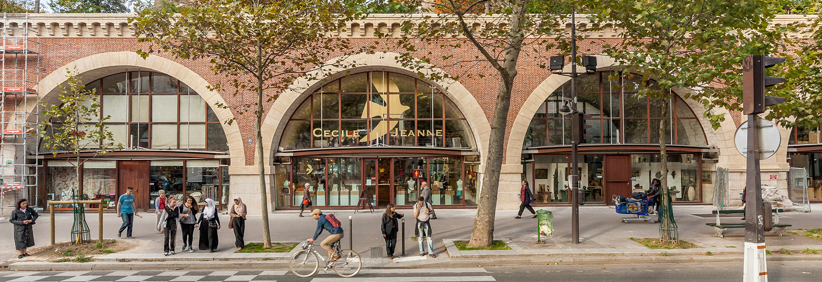 At its west end, near the Bastille, the parkway rises above the surrounding area and forms the Viaduc des Arts, over a line of shops featuring high quality and expensive arts and crafts. The shops are located in the arches of the formerly elevated railway viaduct.