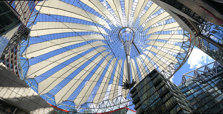 The Sony Center, designed by Helmut Jahn and Peter Walker as landscape architect, is one of the most impressive public spaces in Berlin. Its roof structure is iconic and came to symbolize the whole Potsdamer Platz itself. It is one of the few buildings in the area which offers a public plaza which is always lively and happening. It is the star of the show. Its huge atrium covered by an umbrella-shaped roof contains a cinema, a shop selling Sony gadgets, and the remains of the ground floor of the old Esplanade Hotel.