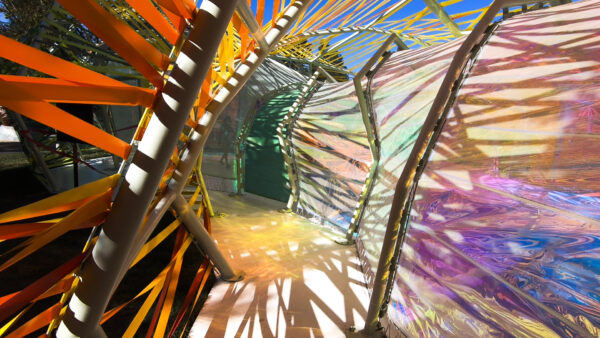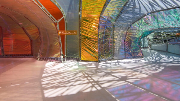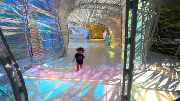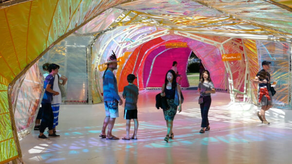 The playful Serpentine Pavilion in Los Angles, erected in-between the La Brea Tar Pits and the Los Angeles County Museum of Art, brings a smile to an area characterized by an eclectic architectural mix. Designed by Spanish architects José Selgas and Lucía Cano, a design partnership known as SelgasCano and based in Madrid, was initially commissioned by the Serpentine Galleries in London and installed at the Gallery’s site in London’s Hyde Park back in 2015. Thanks to a partnership between creative workspace Second Home and the Natural History Museum of Los Angeles, the 866-square-foot area in an X-shaped plan is wrapped with fluorine-based plastic in multiple colors.