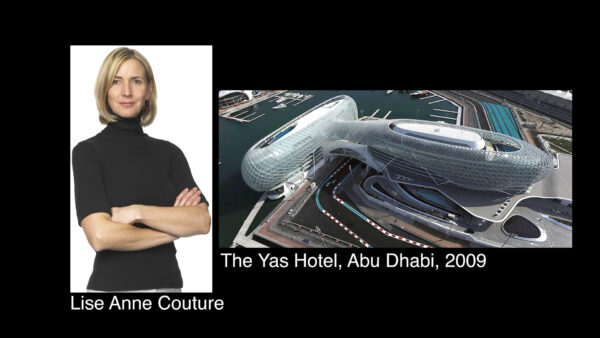 The women architects presented in the documentary come from different countries—Canada, Iraq, Poland, Israel, Mexico, the Netherlands, France, Italy, Spain, Germany, the UK, and the US—and they have built, besides their countries of residence, in Bangladesh, China, Morocco, Saudi Arabia, the Palestinean West Bank, and New Zealand.