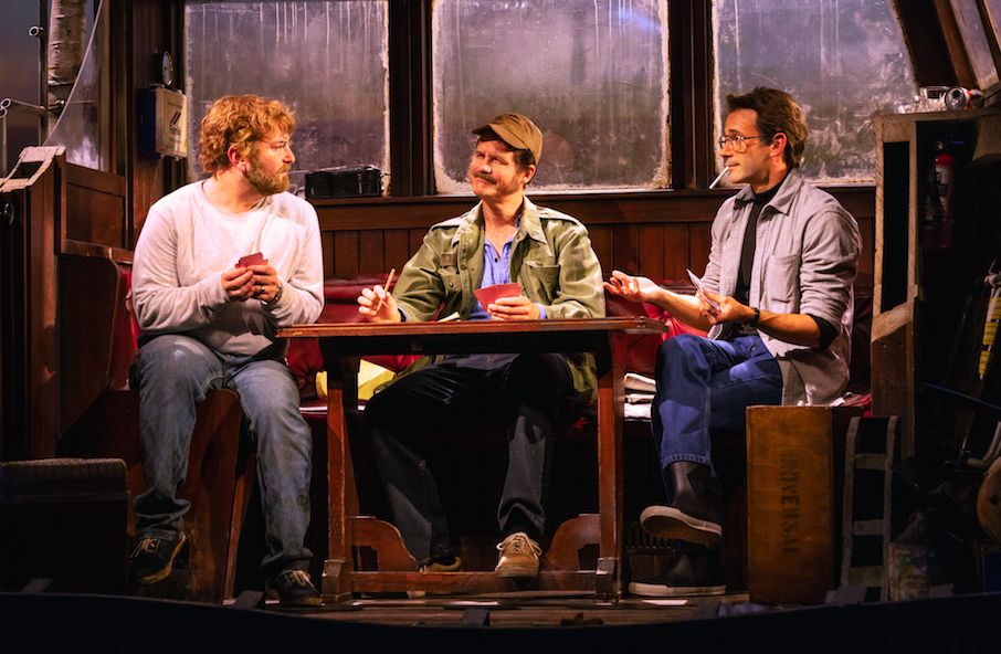 Fortunately, the three-man cast enlivens the material and delivers incisive portrayals of actors at crucial stages of their careers. Brightman is devastatingly funny as the brainy, but child-like Dreyfuss, seeking approval from the more experienced Shaw while challenging the father figure. Donnell has the most difficult assignment since Scheider’s role is so bland. His main activity is reading the newspaper and spouting little-known facts. Yet Donnell manages to create a vital through-line for his role: maintaining peace and getting through the picture with everyone in tact. In the central role, Shaw brilliantly recreates his father’s bluster and charisma and as well as his vulnerability, particularly during drunk scenes. Duncan Henderson’s detailed set of the confining boat and cabin the video design by Nina Dunn for Pixellux create the perfect backdrop for this flawed but fascinating behind-the-scenes comedy-drama.