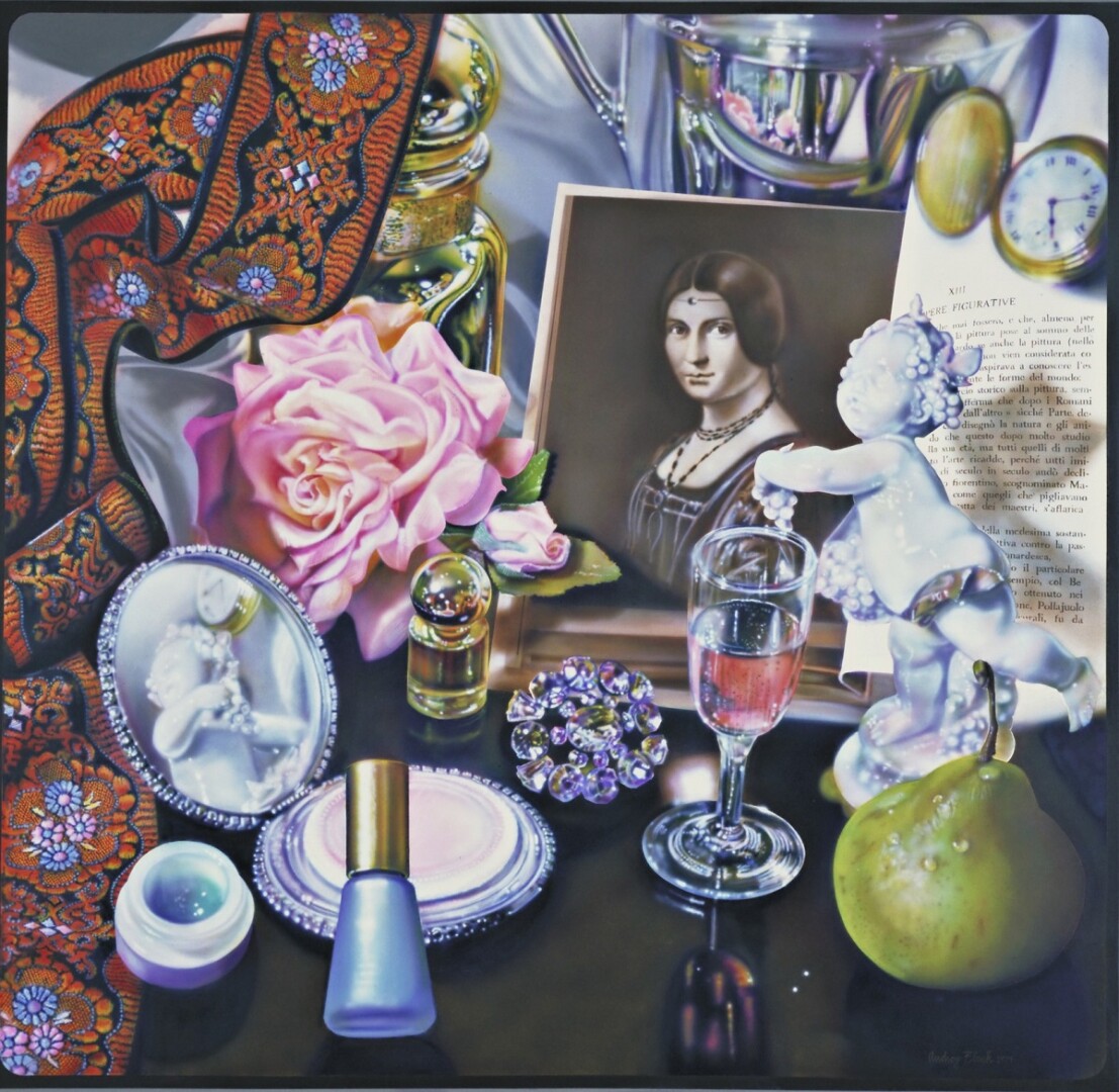 While many of the 94 artworks in the exhibition depict public spaces, there are also intimate indoor subjects including portraits and still-life paintings of ordinary objects such as rows of red lipsticks. Audrey Flack’s Leonardo’s Lady of 1974 shows a dark wooden tabletop overflowing with a woman’s things: jewelry, a pear, a rose, a glass of wine, the edge of an ornate scarf, a gold pocket watch, several small cosmetic jars, and, in the center, a square-framed reproduction of Leonardo da Vinci’s portrait of Frances I’s mistress, La Belle Ferronnière.