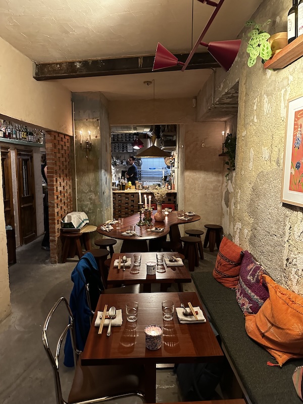 The ambiance in the narrow space is rough-hewn with unfinished walls. The bathroom walls are scrawled with (intentional) graffiti—markers are available for guests to leave their thoughts. It’s an easy, comfortable space. It felt like dinner at a best friend’s place.